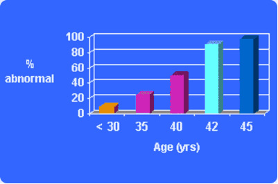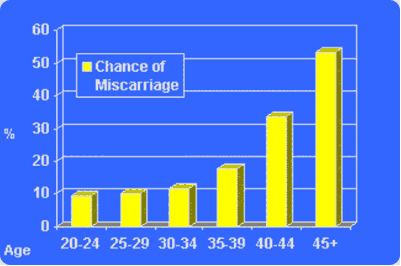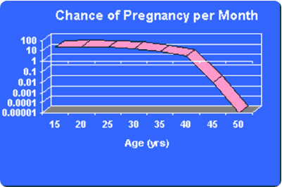 Unfortunately, there are few, if any, outward signs of decline in the reproductive potential of most women. A woman may continue to have regular cycles until she nearly reaches menopause. However, her chance of conception starts to decline at a much younger age (Figure 1), generally around 30 years old. This results in a situation where nearly 1/3 of the couples with a woman 35 or older will have problems with fertility. It has been estimated that only 10-30% of women over 40 can become pregnant on their own. In addition, a woman’s chance of miscarriage also increases with age.
